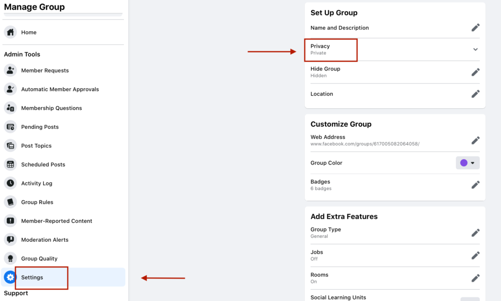 Let’s take a look at each choice and how to decide what’s right for you. And remember that you can edit this at any time by going to your settings and then adjusting the group privacy and visibility settings.