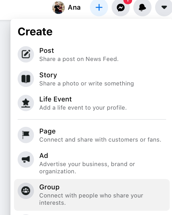 1. You can start by clicking the “+” near your profile picture and finding the “Group” option.