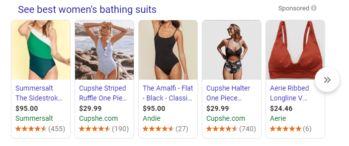 These are ads that show up at the top of the search results when Google users type in a specific phrase, for example, “women’s bathing suits.”