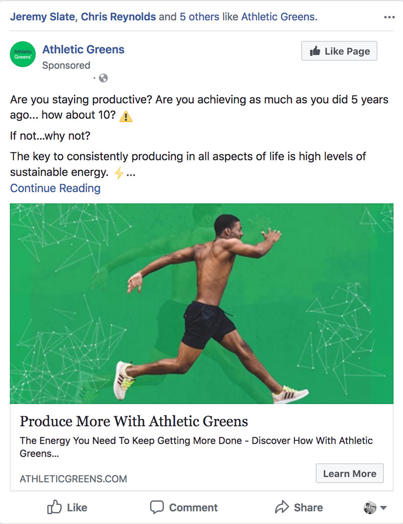 A good example of this is this ad from Athletic Greens, which poses a question: Are you staying productive?