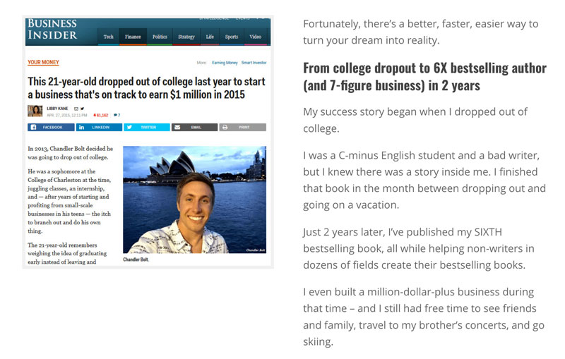 Take a look at the About Page of Self-Publishing School, where Chandler Bolt shares his own hero’s journey from a C-minus English student to bestselling author.
