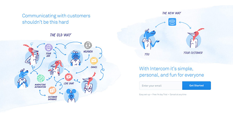Take a look at how Intercom uses “newness” on their site to show how they have innovated on solving a nasty problem many businesses face and how delightful the “new way of doing this” is.