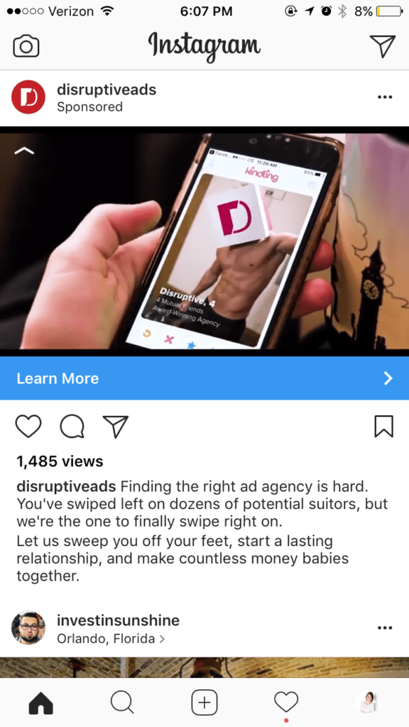 - Get creative. Sometimes the best way to stand out is to do something unconventional. Do whatever you can to grab users’ attention. Smart marketing is just as important on Instagram as it is on any other platform, and it provides a great opportunity to showcase your brand’s personality. A great example is a video ad from Disruptive Advertising that compares finding a marketing agency to online dating.