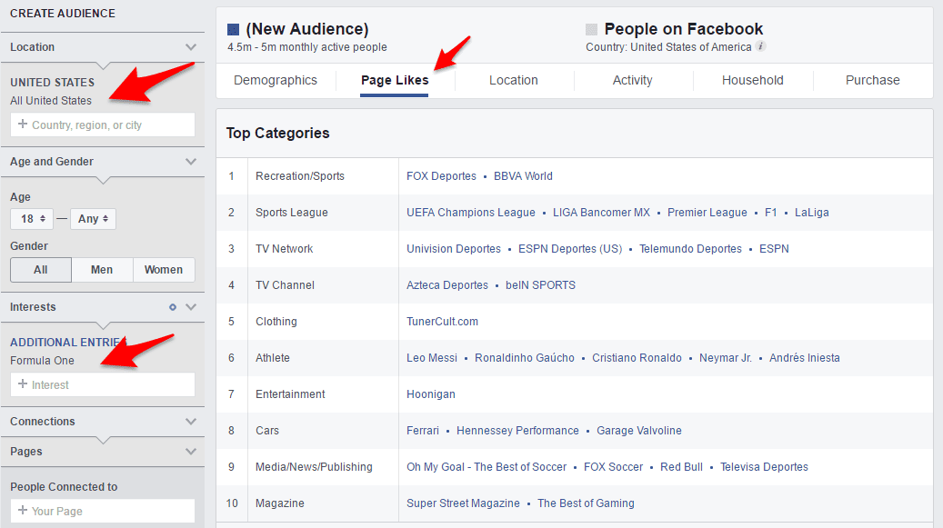 Ideally, I aim to find specific fan pages around the topic with high engagement. Running just one fan page per ad set (along with relevant demographic settings) allows me to laser-target those people and all I have to do is to research the website they’re a fan of. I’ll try to figure out which topics they’re interested in and what language they use before finding my own angle to persuade them with.