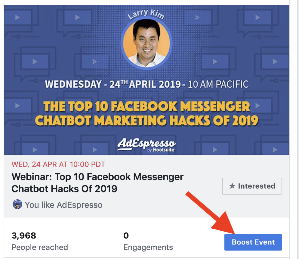 This is a very simple way of setting up an ad campaign for the event. Just hit the “boost” button on the post…