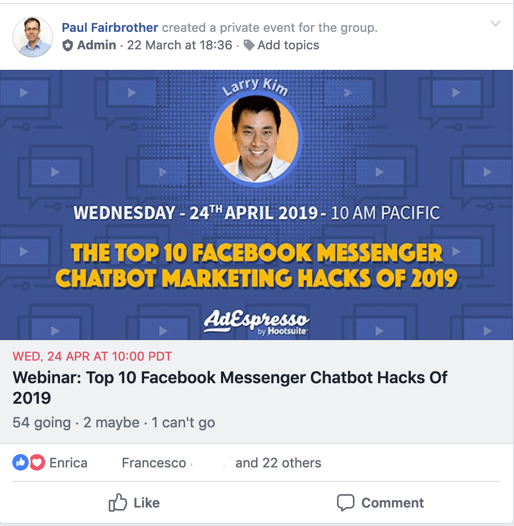 At AdEspresso we always get more organic event responses from our private customer Facebook group than when we post on our business page.