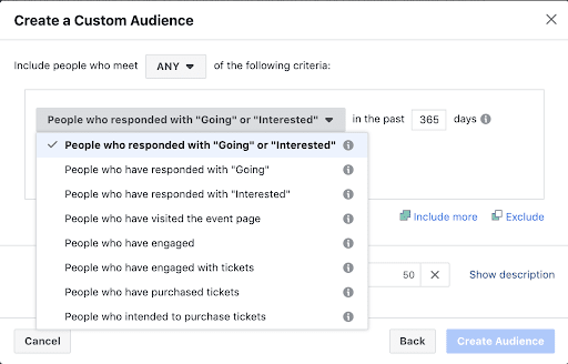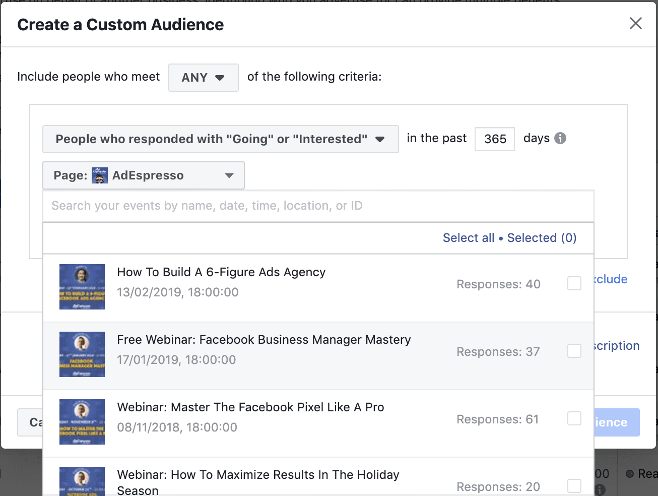 When creating the ad itself, this is when things differ from a normal campaign. Here, select the event to include: