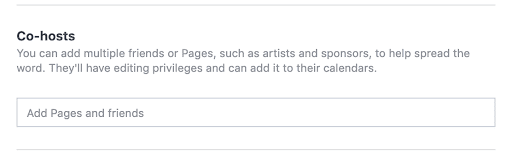 Is your event in collaboration with another brand or public figure? If so, add them in the co-hosts box. The event can then show on their page events calendar and they can boost it and share it with their networks.