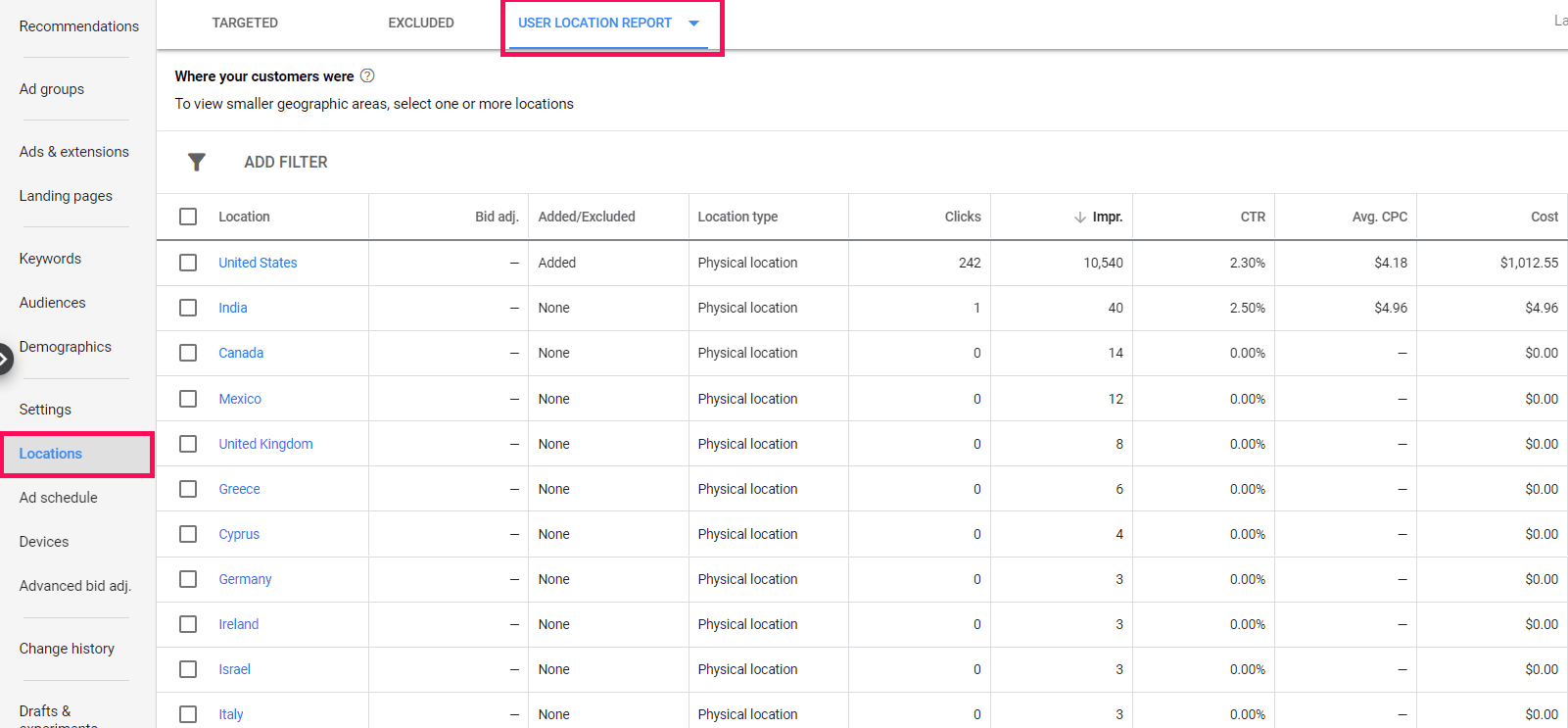 To see if your campaign could benefit from changing these options, you should check out the “User location report” in the “Locations” view.
