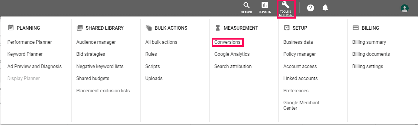 First, log in to your Google Ads dashboard and locate the “Conversions” section: