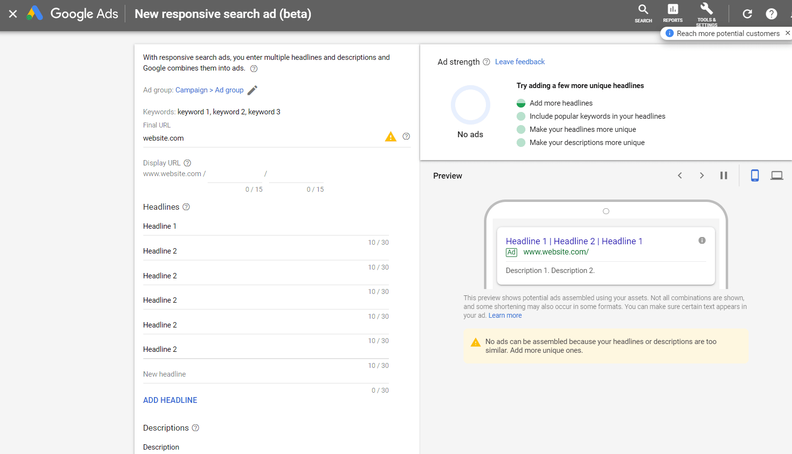 Alternatively, you could use responsive search ads. This ad format lets Google’s algorithm mix and match headlines and descriptions with the individual search queries it thinks matches them best.