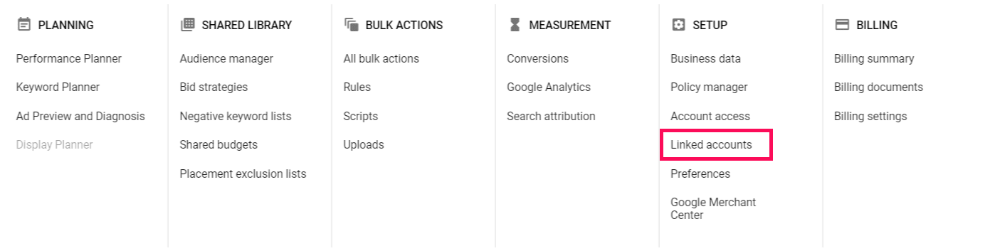 To link Google Analytics, head to “Linked Accounts” in your toolbox under Setup: