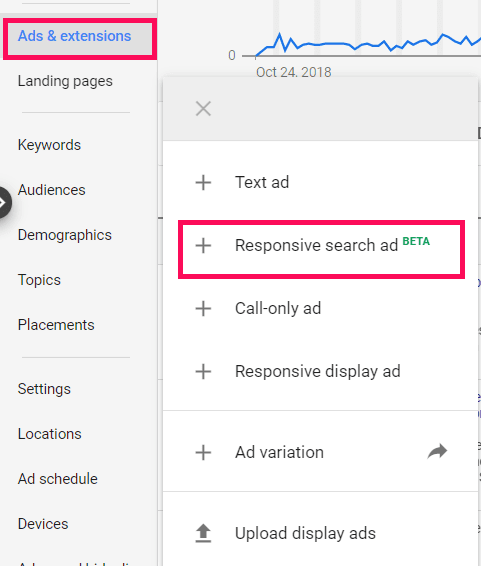 Under “Ads & extensions” simply click the plus mark to create a new ad, and select the “Responsive search ad” option.