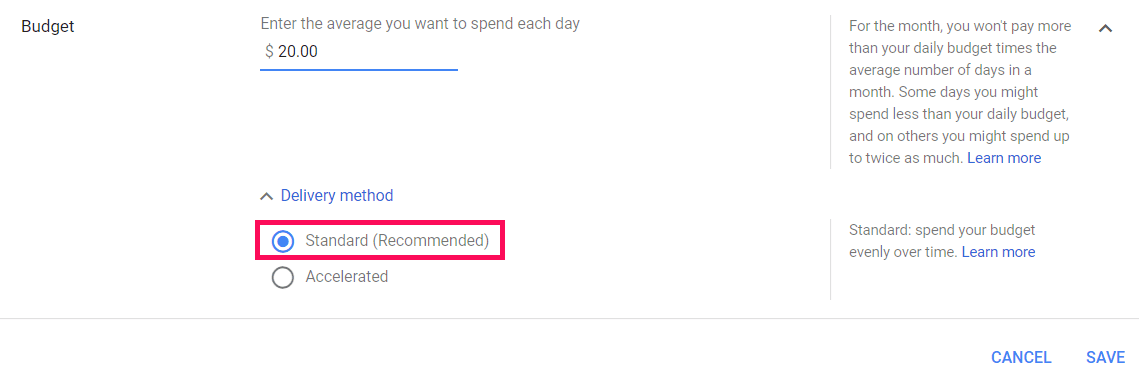 With accelerated delivery, you can end up spending most of your monthly budget in a single day, before you have learned and optimized your campaign.