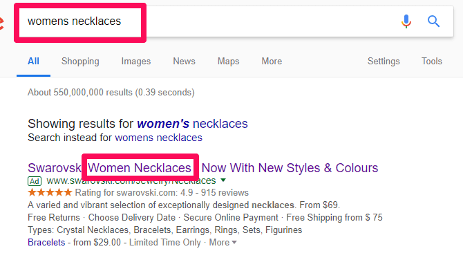 Message match is carrying over the same information that you promise from ads to the landing page. When I search for women’s necklaces, I should see ads that include my keyword search:
