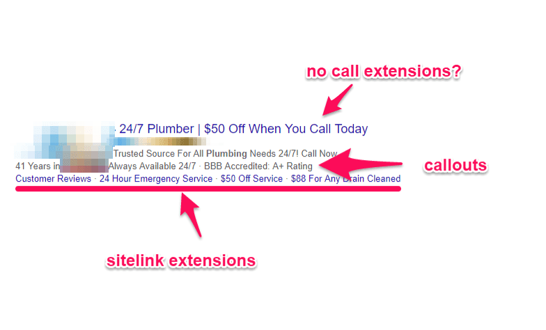 The entire CTA and value of the ad are directed at driving phone calls, yet there are no call extensions or phone numbers!!!