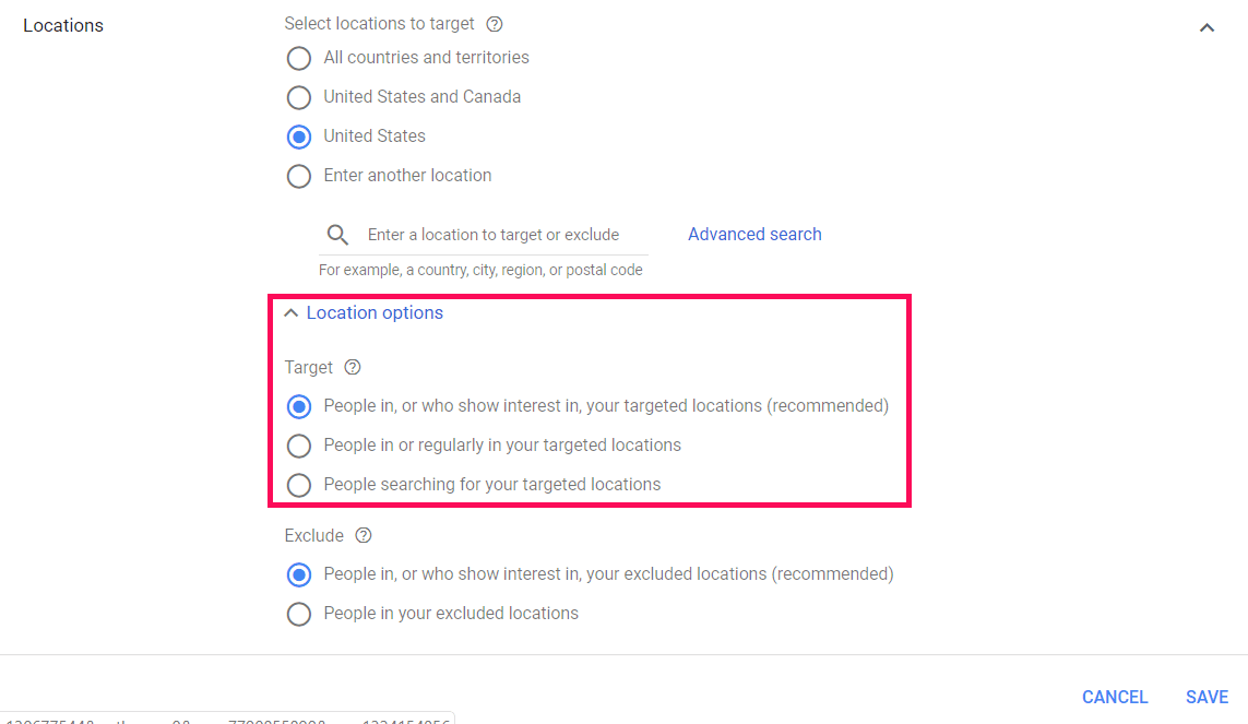 By default, Google shows your ads to “People in, or who show interest in, your targeted locations (recommended).”