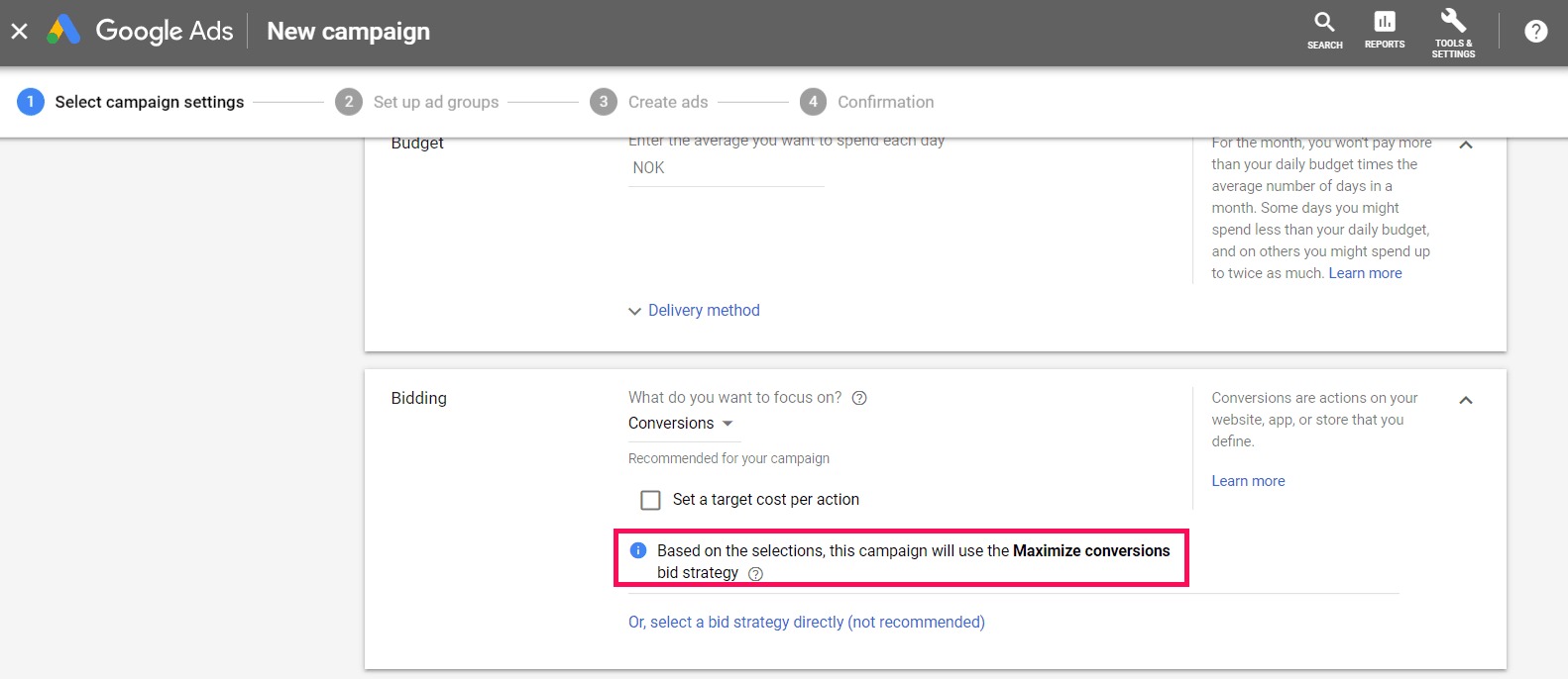 By default, when you create a new campaign, Google will set your “Sales” focused search campaigns to a bidding method called “Maximize conversions.”