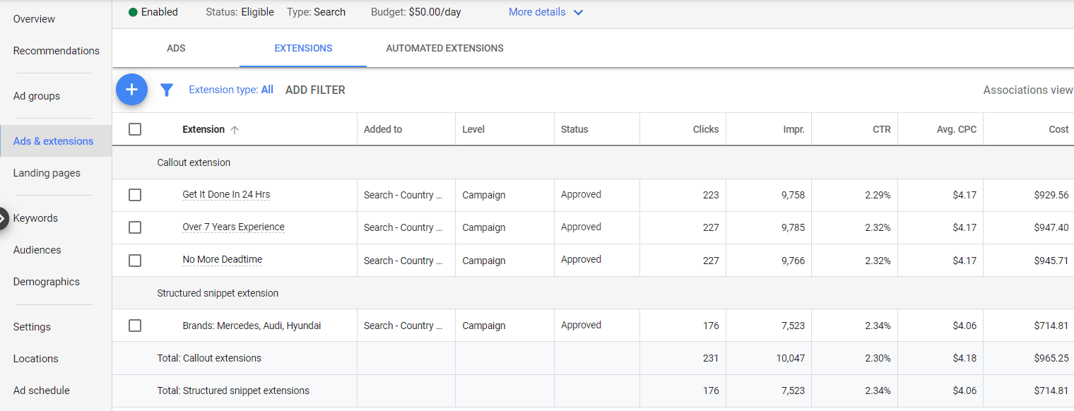 - Assess your current ad extension usage for each campaign.