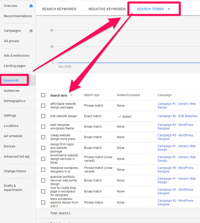 The search terms report is a hidden gold mine on Google Ads. It shows you all of the keyword searches that your ad’s display. And more often than not, you will find dozens of keywords that you aren’t even bidding on. Meaning you are already driving sales from them without even having specific ads targeting those particular search terms.