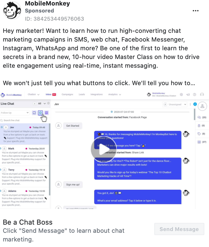 This ad from MobileMonkey is another example of how to use the “Click to Message” approach well.
